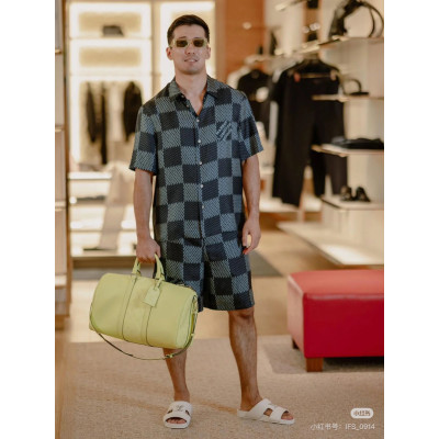 Louis Vuitton 25男士真丝斜纹Damier印花灰蓝短裤 奢华休闲短裤 夏季透气百搭 Louis Vuitton经典老花短裤 商务休闲两用 Louis Vuitton男士高端短裤 真丝材质舒适 Louis Vuitton Damier印花短裤 46-52码可选
