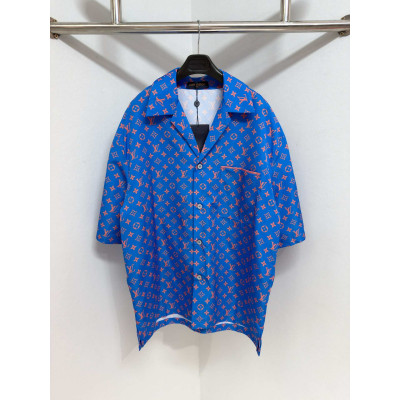 Louis Vuitton 2025 Blue Silk Monogram Glow Short Sleeve Shirt|Stylish Coral Pink Print LV Shirt|Luxury Silk Short Sleeve Shirt for Day|Exclusive Louis Vuitton Monogram Shirt|Trendy Blue Silk Shirt with LV Print