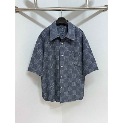 Louis Vuitton LV Letter Logo Cotton Denim Shirt|Stylish LV Raffia Embroidered Short Sleeve Shirt|Trendy Youth Cloth Shirt with LV Monogram|Fashionable Handwritten Louis Vuitton Logo Shirt|LV Cotton Denim Shirt with Embroidered Details