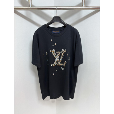 Louis Vuitton 2025 Black Letter Jacquard Cotton T-Shirt|LV Monogram Floral Print T-Shirt|Classic Fit Black LV T-Shirt|Luxury Louis Vuitton Cotton Tee|Stylish LV Moire Pattern T-Shirt