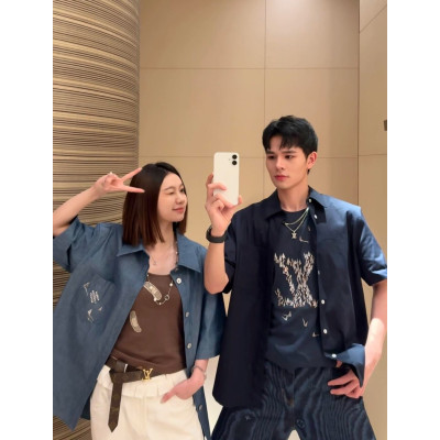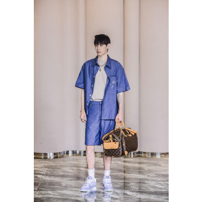 Louis Vuitton 字母徽标棉质牛仔短袖衬衫 LV Raffia刺绣工艺 青年布面料 手写体标识 Louis Vuitton春夏新款男士短袖衬衫 正品保障 S-XL尺码可选 Louis Vuitton男士休闲短袖衬衫套装