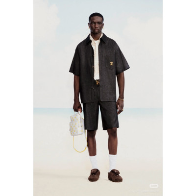 Louis Vuitton 2025春夏新款青年布短袖衬衫 Louis Vuitton Raffia刺绣工艺衬衫 Louis Vuitton 手写体标识休闲衬衫 Louis Vuitton 46/48/50/52码男士衬衫 Louis Vuitton 配套棉质短裤套装