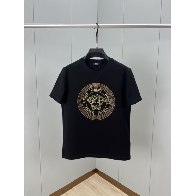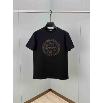 Versace 25 SS New Arrival Heavy Crystal & Gold Medusa Logo Short Sleeve T-Shirt|Custom 80s Double Ply Mercerized Cotton Fabric|Available in Black, White, Navy Blue|Sizes S to XXXL|Custom Sizes 4XL & 5XL Available for Black & White